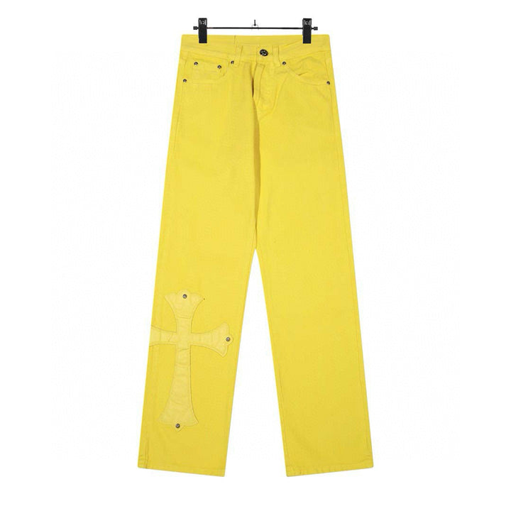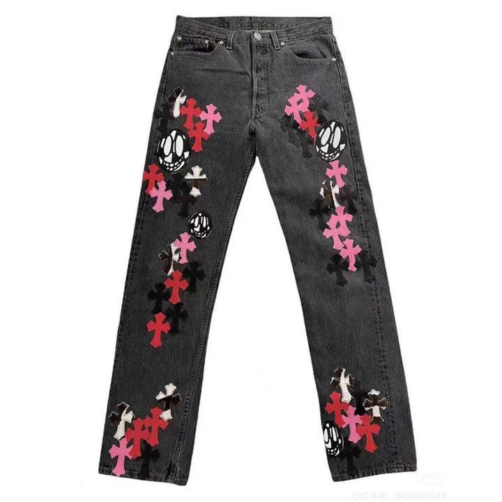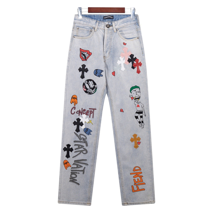 Chrome Hearts Couples Loose Jeans Cross Patch Embroidery Washed Denim Trousers