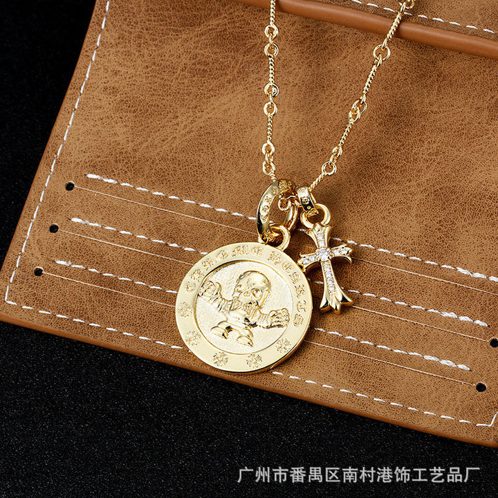 Chrome Hearts Gold Cross with Skull Round Tag Necklace